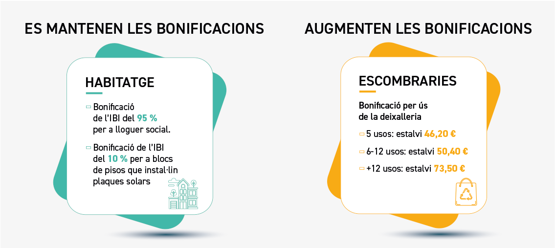 Otra medida que afecta al ámbito de la vivienda es la bonificación del IBI para aquellos bloques de viviendas que instalen placas solares, que también se ha empezado a aplicar este año y que se mantiene en las nuevas ordenanzas. En 2025, 7 comunidades de vecinos se han beneficiado de estas bonificaciones, una más que en 2024. Novedades en las bonificaciones por uso de la recogida de residuos Para fomentar buenos hábitos en la gestión de residuos, las ordenanzas de 2026 incluyen un incremento de 2 puntos porcentuales en todos los tramos de reducciones que se aplican por uso de la recogida de residuos: de 5 usos la bonificación pasa del 20 al 22%; de 6 a 12 usos, pasa del 22 al 24%; y para más de 12 usos, del 33 al 35%.