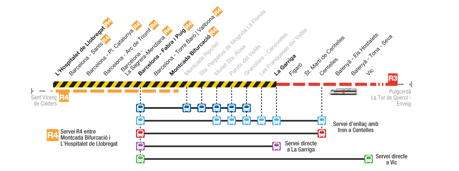 A partir del martes 7 de octubre, el trabajo dividido R3 se reanudará entre parets del Vallès y La Garriga. Durante estos trabajos, ADIF establecerá un servicio alternativo de autobuses para servir a los usuarios afectados durante los 16 meses que el tráfico de los trenes cortó, a partir del 7 de octubre, comenzará el nuevo servicio de autobuses, y en los granoladores la parada se ubicará en el cruce de las calles Manuel de Falla y Mataró, al lado del estacionamiento municipal, junto al estacionamiento municipal, junto al estacionamiento municipal. de Train of Granollers-Canovelles.